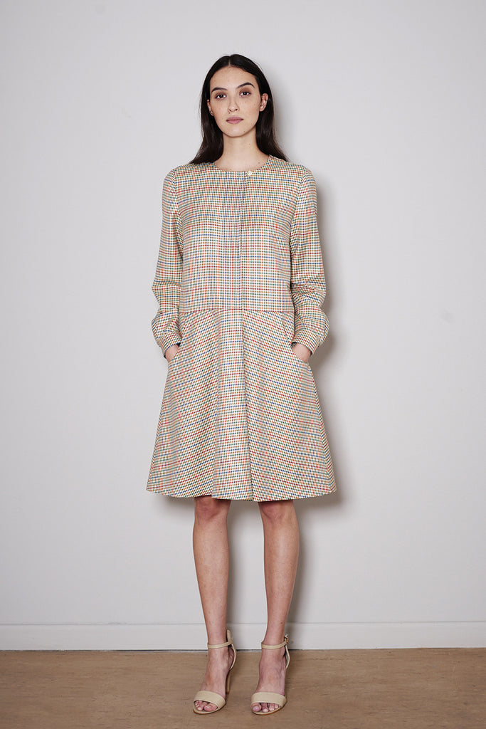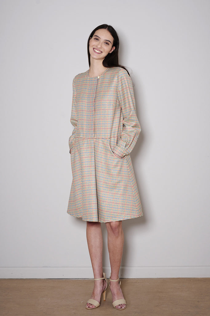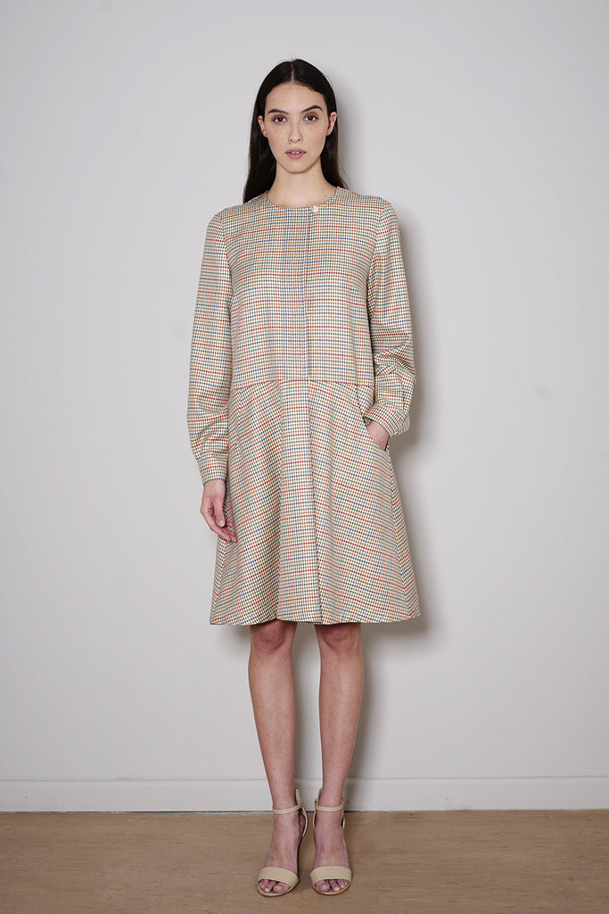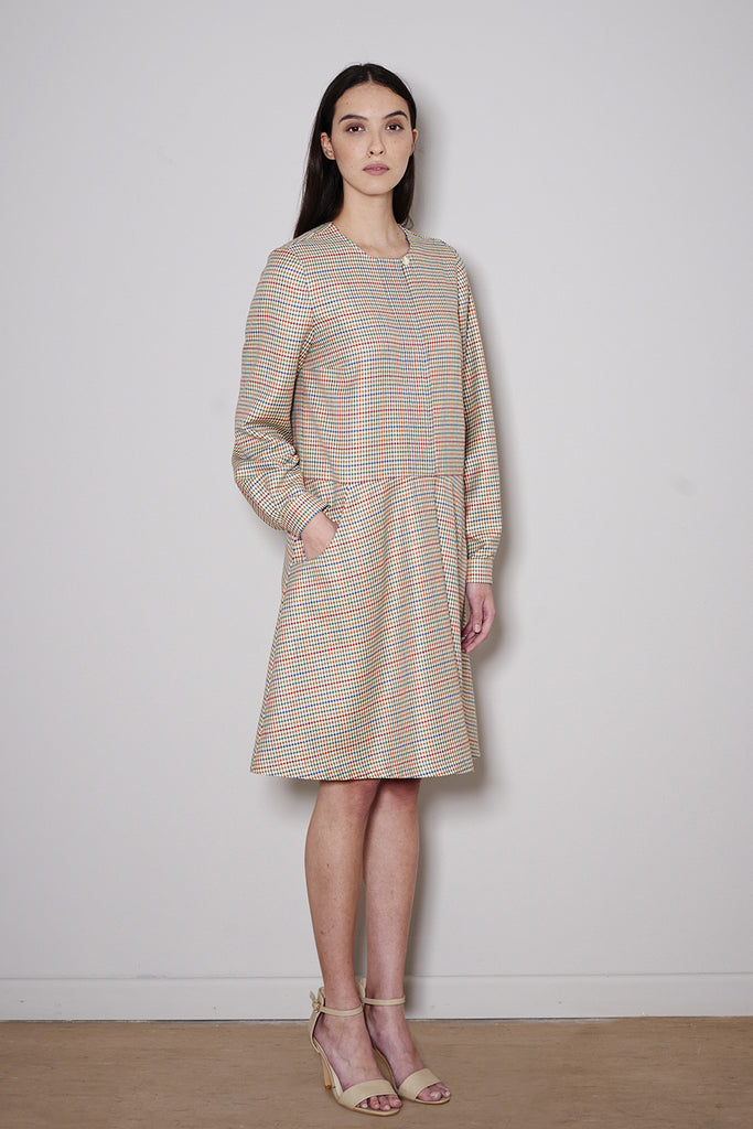 Easy cut dress out of heavy beige checked cotton. the dress has a coverd button border in the front and the skirt two pocket on front sides. Low waist cut, easy fit. knee length.