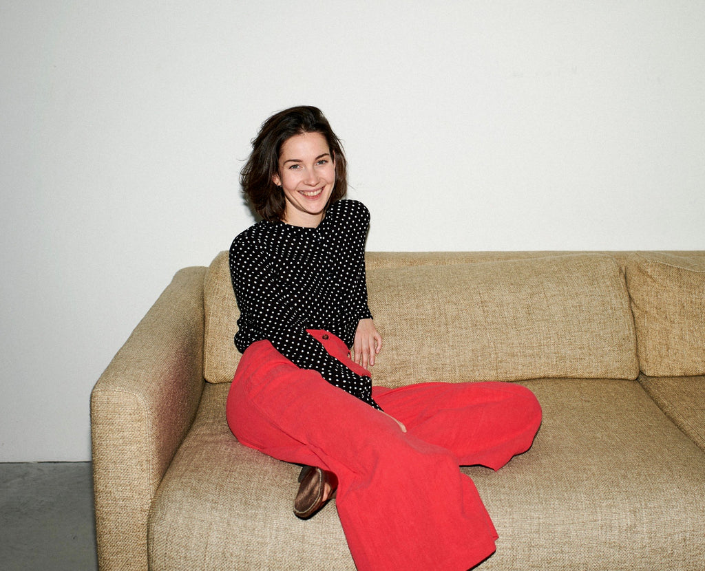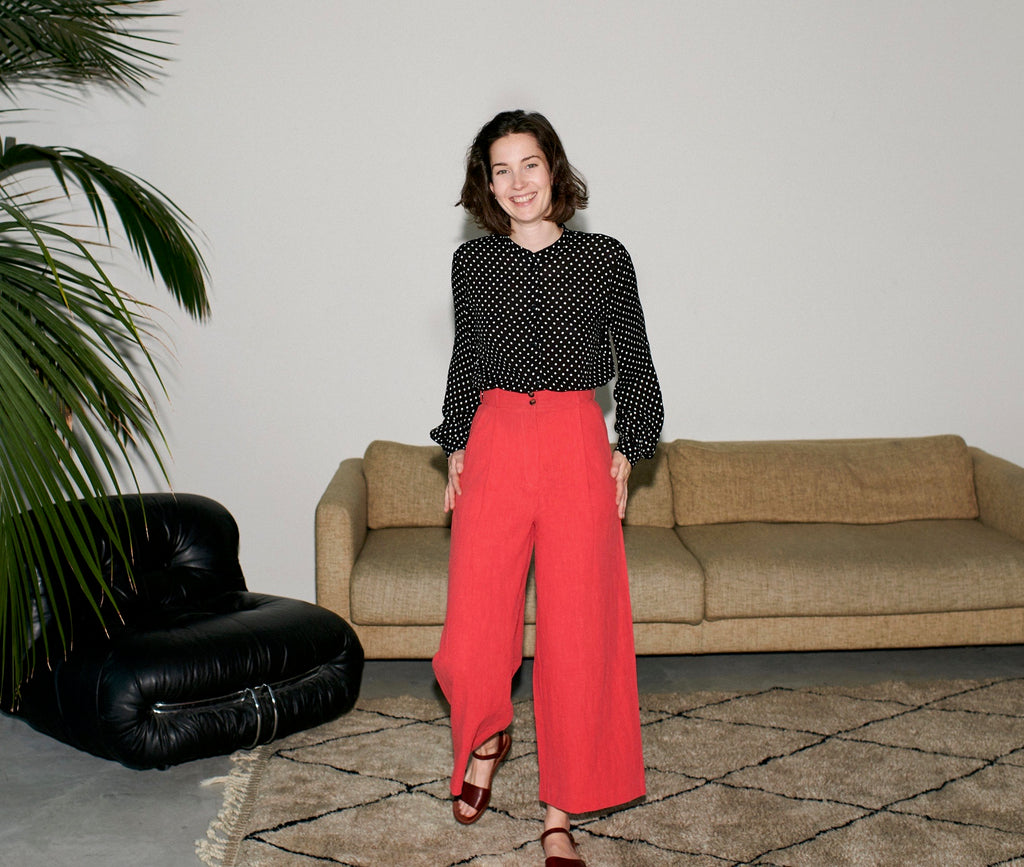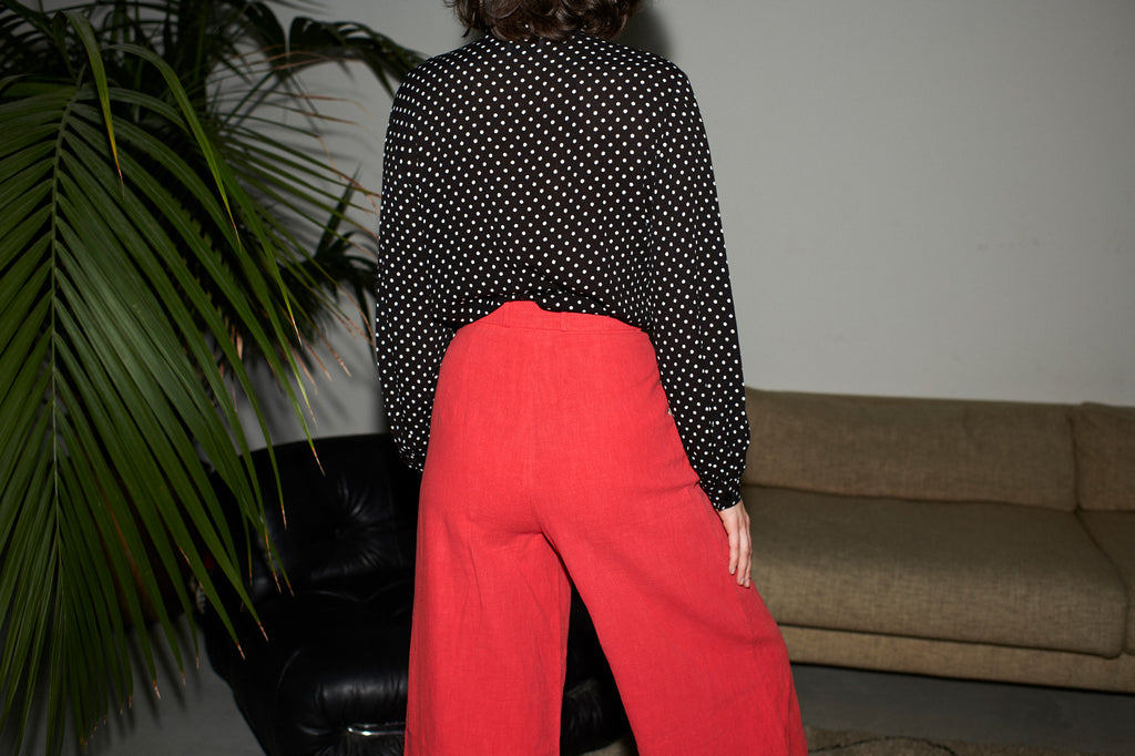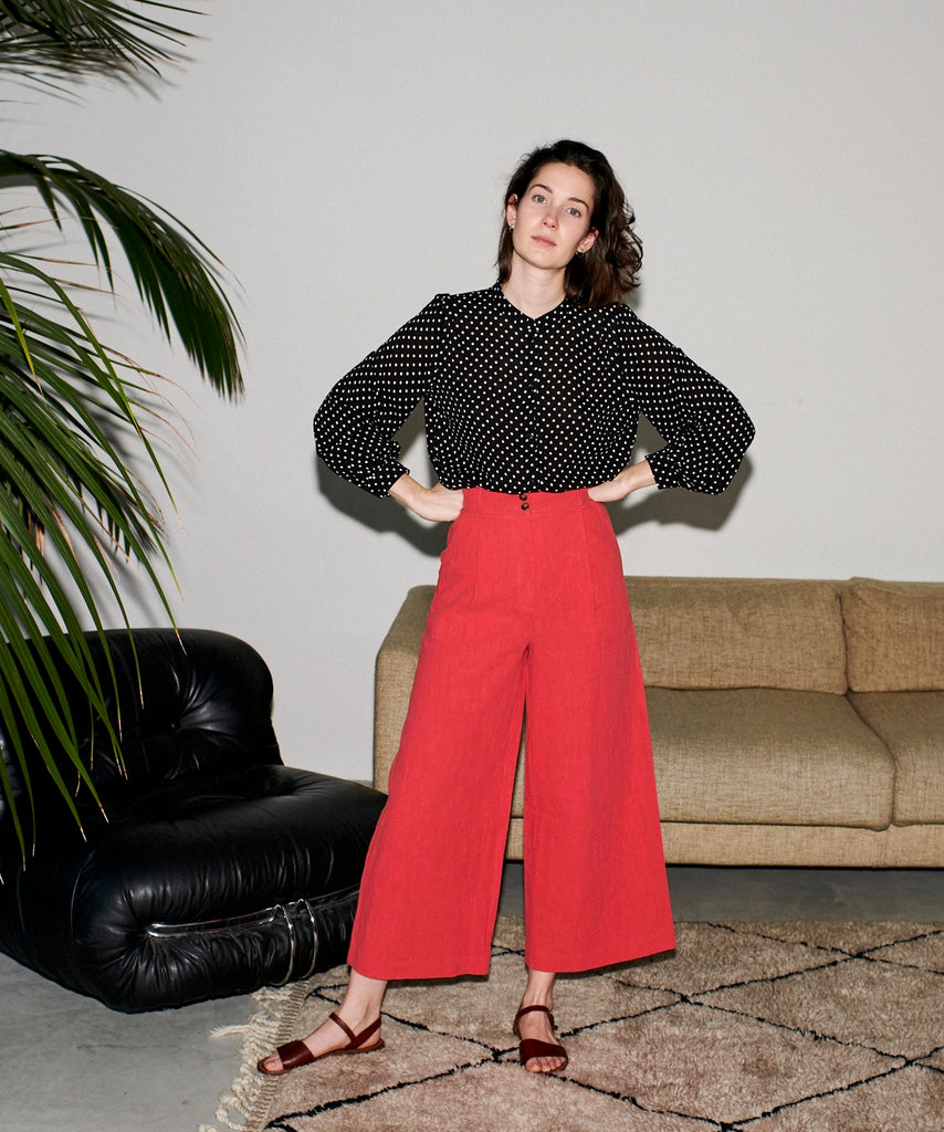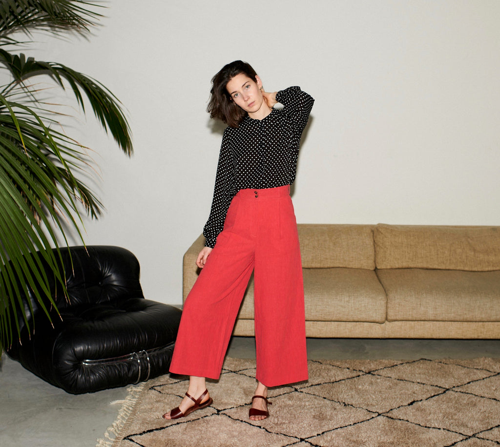 Loose pants with two pockets and a wide waistband with belt loops that emphasizes a slim waist.
